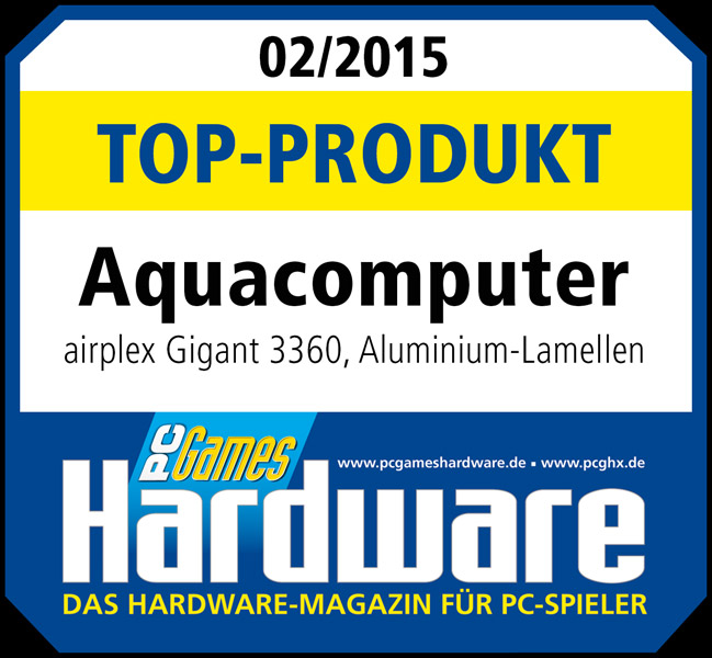 Das Magazin PC Games Hardware hat in der aktuellen Ausgabe 02/2015 den airplex GIGANT 3360 in der Aluminium-Version unter die Lupe genommen. Der Radiator hinterließ nicht nur auf Grund seiner Größe Eindruck, sondern konnte auch mit einer dort bezeichneten "Luxusleistung" glänzen und sicherte sich am Ende den Top-Produkt Award.